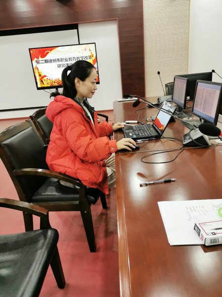 首先,课题主持人王诗盼汇报了《互联网+背景下的市场营销专业教师信息化素养提升的实践研究》的课题研究报告。
