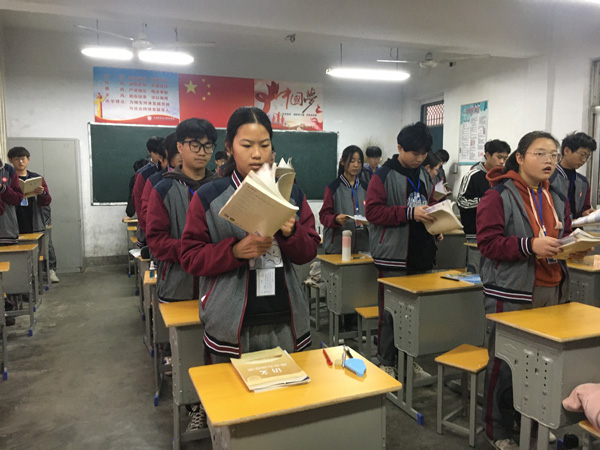 第四个来到商贸信息系,21计算机3+3班穿着整齐的校服,每个同学都投入在班主任领读的境界里,青春风采,一道亮丽的风景。