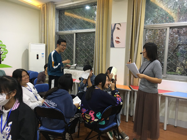 接着,朱婧带领学生开始新授课的启程,主题活动一:我的百宝箱,用意象对话的技术,朱婧老师说:“请同学们选择一个舒服的姿势坐好,轻轻地闭上眼睛,想象一下,你眼前一个百宝箱,里面装满了你的优点和长处。请你打开你的百宝箱,看到了什么呢,再往里看,又看到了什么,也许再往里看有一定难度,比较吃力,坚持,又意外的发现了什么?这些都是你的宝贝,如果感到可以了,就随着老师喊3、2、1慢慢地睁开你的眼睛。好,非常好,轻轻地揉揉你的眼睛,把你看到的静静地把你看到写下来,不用写名字。”同学们写出自己的优点,不记名字收上来,我让同学分享来猜猜是谁?又加深了有点的肯定。