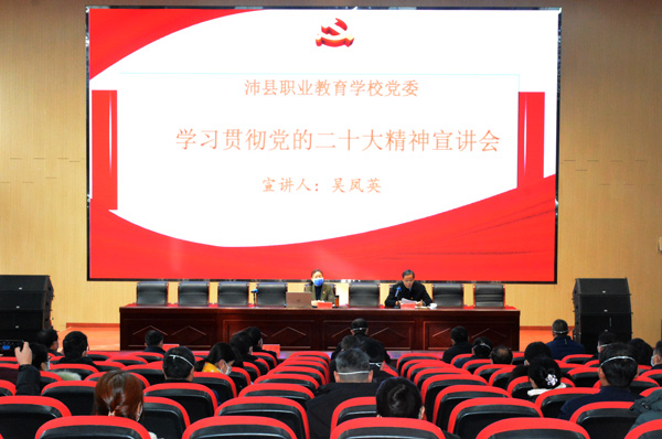 沛县职业教育学校党委书记吴凤英以二十大报告中的新观点、新论断、新思想为主题,进行深入学习贯彻党的二十大精神宣讲。紧紧围绕党的二十大主题,过去5年的工作和新时代10年的伟大变革,开辟马克思主义中国化时代化新境界等八个方面内容进行了全面系统的阐述。同时对二十大报告中关于教育方面的论述作了重点解读。