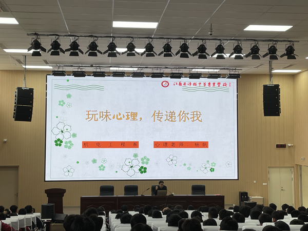 为全面落实徐州市教育局“润心”行动的工作要求,提高学生应对挫折能力,培养学生心理资本,增加学生心理韧性,切实优化学校心理健康教育服务,2023年11月9日10时,江苏省沛县中等专业学校专职心理教师杨帆,在B3三楼阶梯教室,为机电工程系23级学生开展了以“玩味心理,传递你我”为主题的青少年挫折教育讲座,机电工程系23级全体学生及班主任参加了此次讲座。