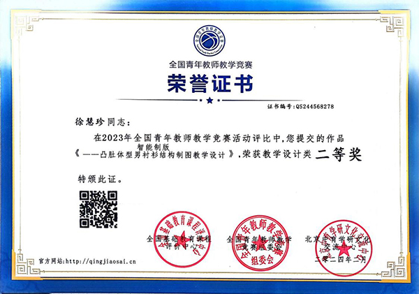 2023 年全国青年教师教学竞赛中,我校“锦绣班主任工作室”主持人——教师徐慧珍凭借出色表现勇创佳绩。她所提交的《凸肚体型男衫结构制图教学设计》在众多优秀作品中脱颖而出,斩获教学设计类二等奖。此次获奖彰显了徐慧珍老师扎实的专业知识和卓越的教学能力,尤其在智能制版领域展现出独特的教学智慧。这不仅是徐慧珍老师个人的荣耀,更是我校“锦绣班主任工作室”成员——教学水平和师资力量的有力证明,激励着全体教师不断追求卓越教学。