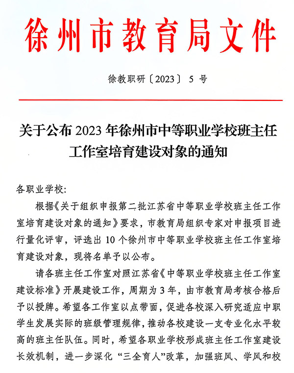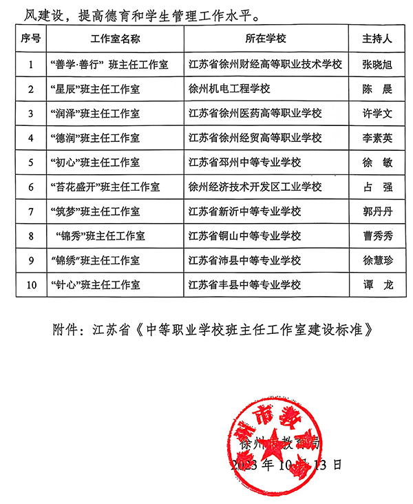 热烈祝贺我校“锦绣班主任工作室”被评为第二批徐州市中等职业学校班主任工作室培育建设对象