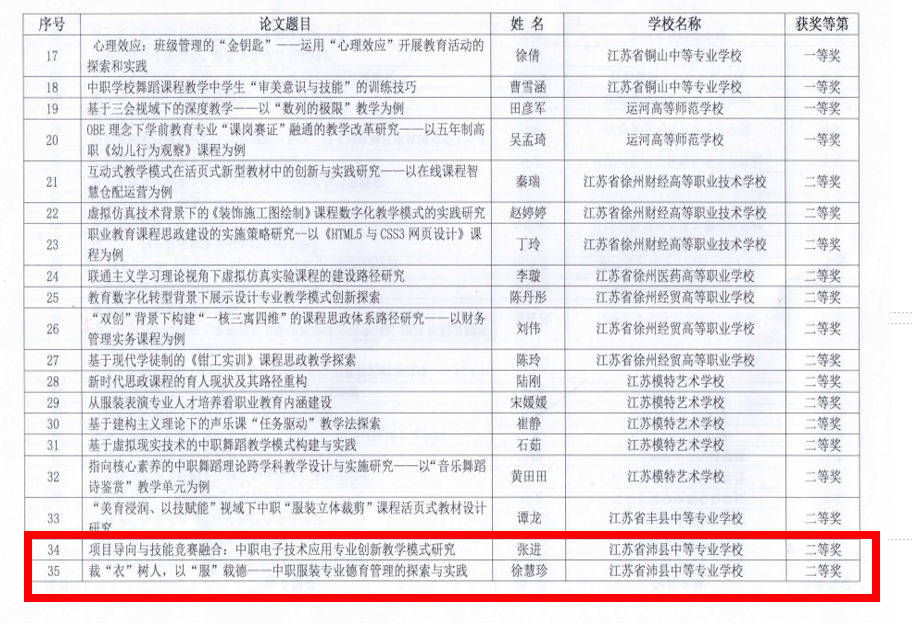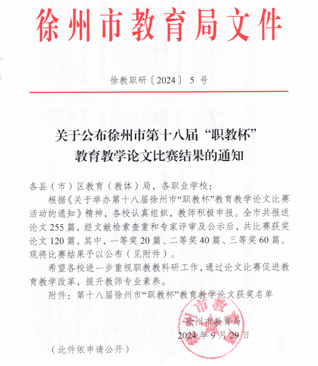 近日,徐州市教育局公布了徐州市第十八届 “职教杯” 教育教学论文比赛结果,“锦绣”班主任工作室成员徐慧珍、张进老师在此次比赛中荣获二等奖。此次比赛共收到全市各校报送的论文 255 篇,经严格评审,120 篇论文获奖,其中二等奖 40 篇。徐慧珍、张进老师凭借扎实的专业知识和出色的教育理念在众多参赛者中脱颖而出。这一荣誉不仅是对两位老师的肯定,更是对锦绣班主任工作室教科研工作的认可。