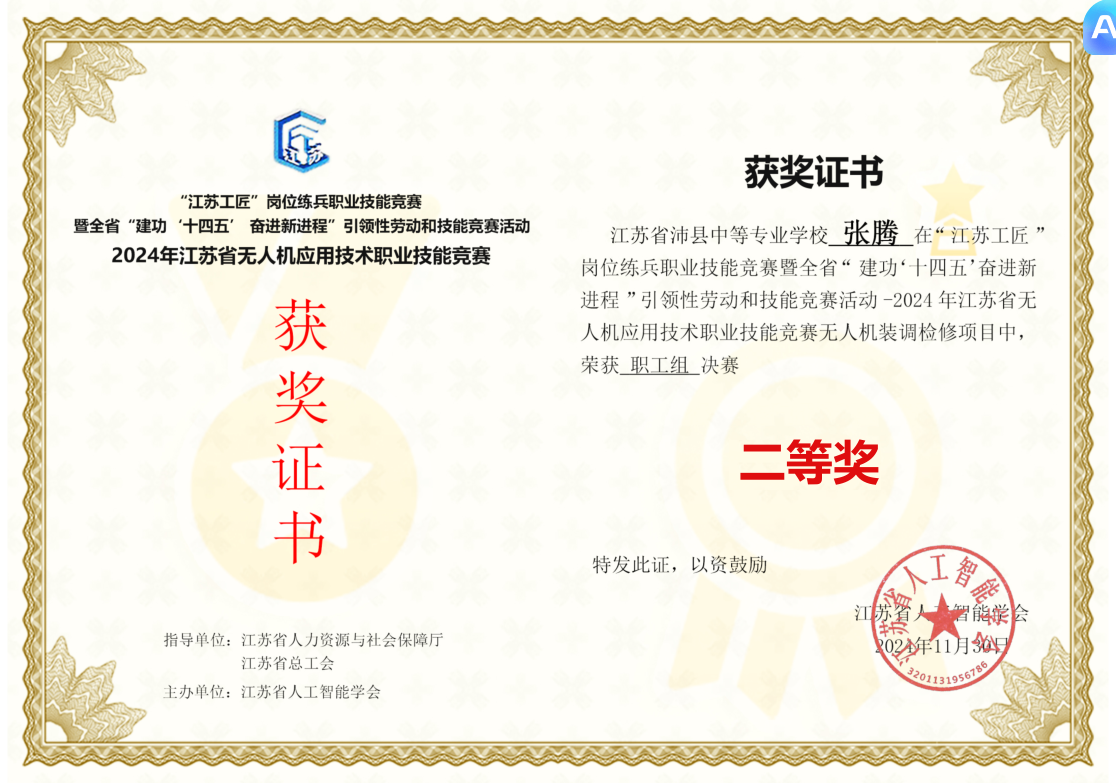 “锦绣” 班主任工作室2024 年11月再传好消息,江苏省沛县中等专业学校锦绣班主任工作室成员张腾老师在此次竞赛中表现出色,荣获无人机装调检修项目二等奖。