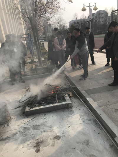 上午10点,演习开始。首先是干粉灭火器油火扑灭。演练人员在火情初期使用干粉灭火器灭火。参演人员练习使用灭火器灭火。演练成功。