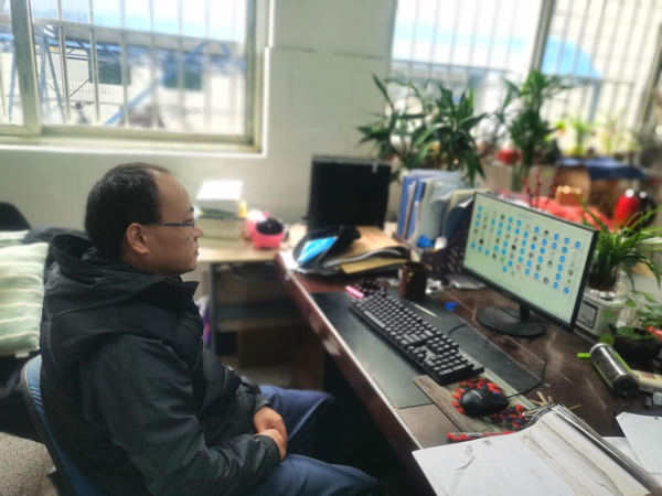 上图为建筑工程系杨新田主任在认真聆听学测考试腾讯会议精神