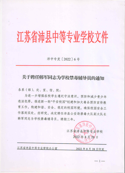 关于聘任韩军同志为学校禁毒辅导员的通知